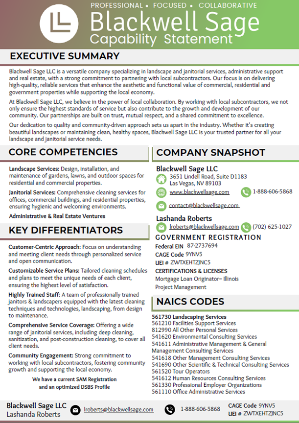 Our Capability Statement highlights Blackwell Sage LLC's core competencies, qualifications, and industry-specific experience. It serves as a powerful tool to communicate our unique value proposition to potential clients, partners, and contracting officers. By outlining our expertise in landscaping, janitorial services, and administrative & real estate management, as well as personnel management and HR services, the statement demonstrates our ability to deliver high-quality solutions across multiple sectors.